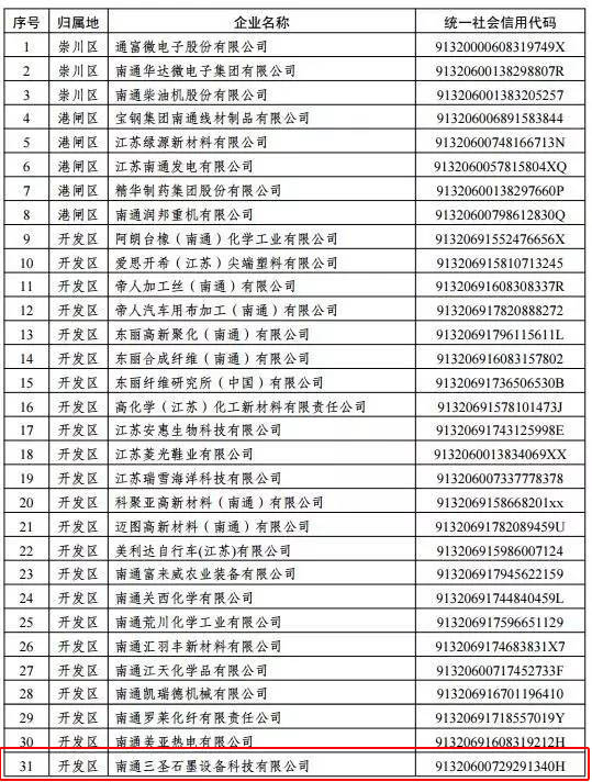 6月2日上午,南通市環(huán)保局公布了關(guān)于2016年度南通市區(qū)非國控企業(yè)環(huán)境信用等級評定結(jié)果的通知,經(jīng)對南通市區(qū)406 家非國控企業(yè)2016 年度環(huán)境信用進行評審,確定南通三圣石墨設(shè)備科技股份有限公司等50家單位為綠色企業(yè)。