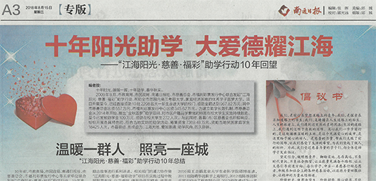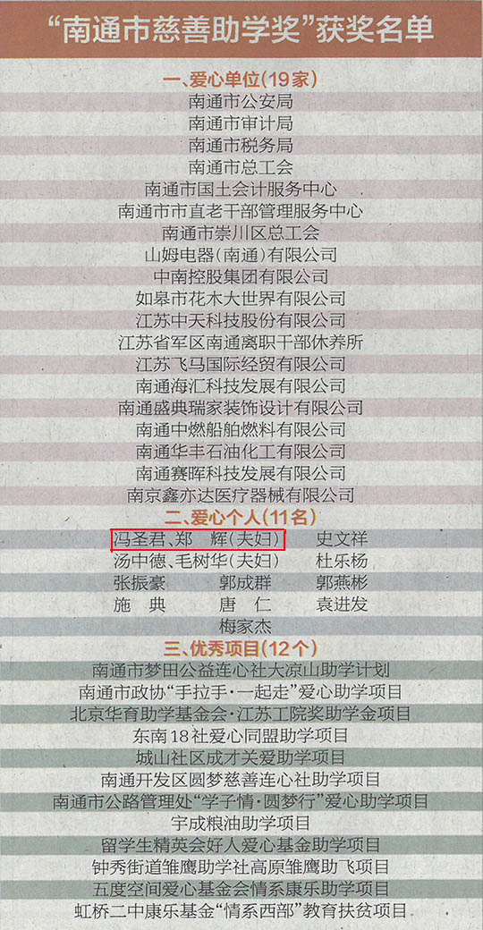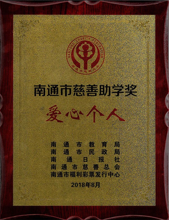 2018年8月15日,南通市教育局、南通市民政局、南通日報社、南通市慈善總會、南通市福利彩票發(fā)行中心公布了“南通市慈善助學(xué)獎”評選結(jié)果,南通三圣石墨設(shè)備科技股份有限公司董事長馮圣君、鄭輝夫婦榮獲“南通市慈善助學(xué)獎愛心個人”光榮稱號,全市僅有11人獲此殊榮。