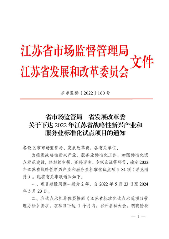 江蘇省戰(zhàn)略性新興產(chǎn)業(yè)標(biāo)準(zhǔn)化試點(diǎn)項(xiàng)目由省市場(chǎng)監(jiān)督管理局和省發(fā)展和改革委員會(huì)共同組織。項(xiàng)目對(duì)申報(bào)單位有著明確的要求:市場(chǎng)占有率和經(jīng)濟(jì)效益排名位于本地區(qū)同行業(yè)前列,具有良好的發(fā)展?jié)摿?,具備統(tǒng)籌技術(shù)創(chuàng)新、標(biāo)準(zhǔn)研制和產(chǎn)業(yè)化的能力等等。