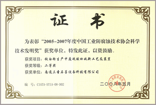 該技術通過了江蘇省科技廳科技成果鑒定,先后獲得:南通市人民政府科學技術進步二等獎、武漢市人民政府科學技術進步二等獎、中國工業(yè)防腐蝕技術協(xié)會科學技術發(fā)明二等獎并在多家鈦白企業(yè)中得到了應用。