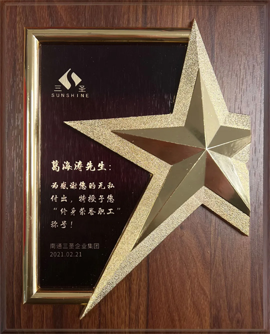 三圣奮斗史中閃耀著這樣一顆璀璨之星,他以堅(jiān)定的信念和不懈的努力,登上榮譽(yù)巔峰,成為開發(fā)區(qū)當(dāng)之無(wú)愧的一名“金牌員工”,并被三圣集團(tuán)董事會(huì)、三圣工會(huì)授予“終身榮譽(yù)職工”的光榮稱號(hào)。